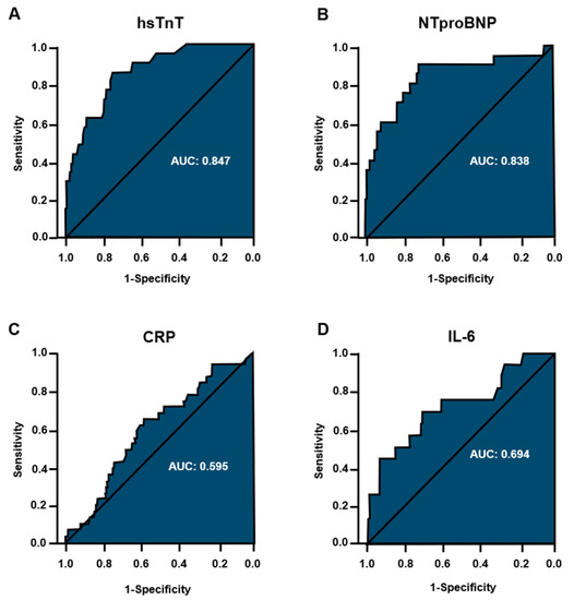 Receiver operating characteristic curve (ROC) analyses for biomarkers in relation to incident arrhythmia. ROC curves and the corresponding area under the curve (AUC) values were calculated after conducting univariate logistic regression modeling to predict incident arrhythmia for each biomarker, respectively. (A) hsTNT = high-sensitive troponin T; optimal cut-off value according to Youden index analysis: 27.5 pg/mL. (B) NTproBNP = n-terminal pro-B-type natriuretic peptide; cut-off value: 1518 ng/L. (C) CRP = C-reactive protein; cut-off value: 120.5 mg/l. (D) IL-6 = interleukin-6; cut-off value: 82.5 ng/L.