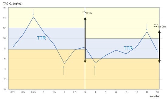 Evolution of tacrolimus trough levels during follow up in a patient from our cohort. TTR (blue area), time in the therapeutic range; times above (yellow area) and below (orange area) the therapeutic range are also shown. CV 0-1bx, coefficient of variability of tacrolimus between transplant and the first surveillance biopsy (29.3%); CV 1bx-2bx, coefficient of variability of tacrolimus between the first and the second surveillance biopsies (24.5%). In the x-axis, time of follow up (months) is presented, while in the y-axis, tacrolimus trough levels (ng/mL) are depicted. Arrows indicated determinations above and below the therapeutic range.