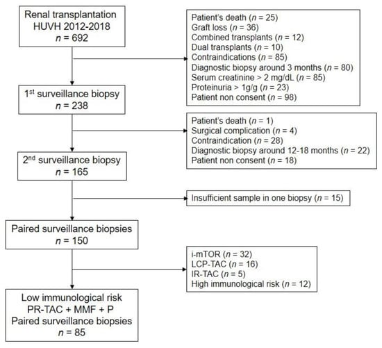 We conducted a prospective, longitudinal, observational study in renal transplants performed at our Renal Transplant Unit since January 2012 until December 2018. All living and donor deceased single kidney transplants performed in adult patients were considered. A first surveillance biopsy at 3–5 months after transplantation was performed in patients fulfilling the following criteria: (a) serum creatinine lower than 2 mg/dL; (b) stable renal function defined as a variability of serum creatinine lower than 15% between the determination at the time of biopsy and the previous one; (c) urinary protein creatinine ratio lower than 1 g/g; (d) non-use of oral anticoagulants; (e) non-technical difficulties to perform a renal biopsy (e.g., patients with large abdominal obesity, patients with large perirenal hematomas or patients with an idiomatic barrier were not considered) and (f) written informed consent. A second biopsy was performed in all patients at 12–18 months regardless of renal function and proteinuria.