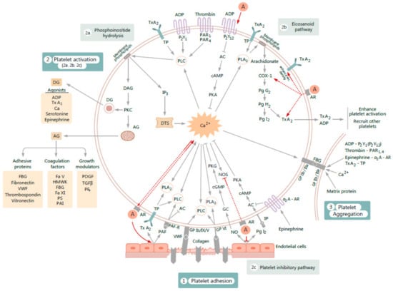 Primary platelet adhesion (1) is initiated by the binding of vWF (von Willebrand factor) to a specific glycoprotein (GP) from a circulating platelets’ surface, GP Ib/IX/V, and also to the subendothelial collagen. This transient “bridge” retains platelets in the injured area and facilitates the contact of other surface GP, GP VI with collagen. This further induces intracellular signaling, leading to platelet activation and the release of secondary platelet agonists, such as thromboxane A2 (TxA2) and adenosine diphosphate (ADP), from platelets’ dense granules. These soluble agonists, together with locally produced thrombin, contribute to platelet activation trough distinct but interconnected pathways []. In addition to its role as a platelet adhesion receptor, GP Ib/IX/V can mediate the intracellular signals, involving the phospholipase C (PLC) pathway and the TxA2 and ADP pathways, finally leading to the activation of integrin αIIbβ3 []. GP VI is the major signaling receptor for collagen on the platelet surface. Platelet activation by GP VI is intermediated by the activation of PLC, ADP release from platelet dense granules (DG) and TxA2 synthesis from arachidonic acid [].