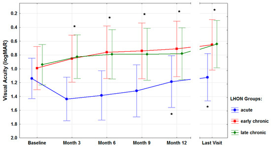 Visual acuity over time in the different groups of LHON patients treated with idebenone. Time from LHON onset at treatment initiation was <1 year in acute patients, 1–5 years in early chronic patients and >5 years in late chronic patients. Data are presented as least square means and 0.95 confidence intervals; logMAR scaling was reversed to depict an increase as an upward shift. * Statistically significant changes from nadir or baseline in acute and chronic groups, respectively (p < 0.05, ANOVA).