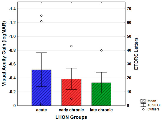 Visual acuity gains in the different groups of LHON patients treated with idebenone. Maximum changes from nadir or baseline in acute and chronic groups, respectively. Time from LHON onset at treatment initiation was <1 year in acute patients, 1–5 years in early chronic patients and >5 years in late chronic patients. Data are presented as means and 0.95 confidence intervals (CI); logMAR scaling was reversed.