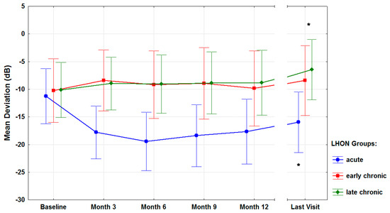 Visual field mean deviation over time in the different groups of LHON patients treated with idebenone. Time from LHON onset at treatment initiation was <1 year in acute patients, 1–5 years in early chronic patients and >5 years in late chronic patients. Data are presented as least square means and 0.95 confidence intervals. * Statistically significant change from nadir or baseline in acute and chronic groups, respectively (p < 0.05, Wilkoxon signed-rank test).