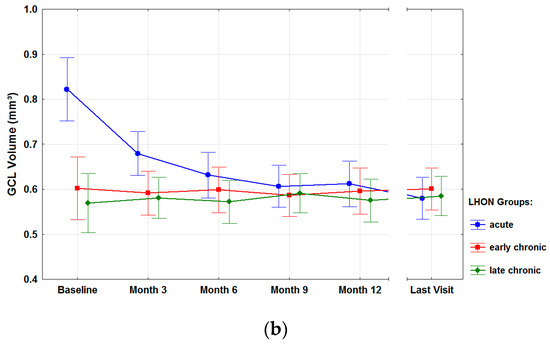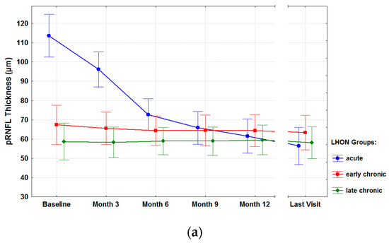 OCT measurements over time in the different groups of LHON patients treated with idebenone. Time from LHON onset at treatment initiation was <1 year in acute patients, 1–5 years in early chronic patients and >5 years in late chronic patients. (a) Peripapillary retinal nerve fiber layer (pRNFL) thickness. (b) Macular ganglion cell layer (GCL) volume. Data are presented as least square means and 0.95 confidence intervals.