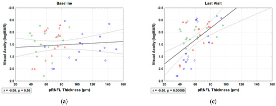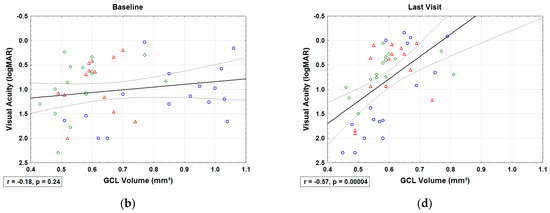 VA of all patients was not significantly associated with pRNFL thickness or GCL volume at baseline (Figure 6a,b). This was also the case in separate analysis of acute and chronic patients (Supplementary Figure S1). However, at the last visit both parameters in OCT showed strong correlations with VA (Figure 6c,d). Separate analysis of acute and chronic patients at the last visit also showed significant correlations (Supplementary Figure S1). VA gain in all patients was weakly associated with GCL volume at baseline (r = 0.36, p = 0.01), but not with pRNFL thickness, patient age or disease duration.