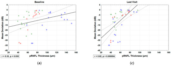 MD and CD of all patients at baseline showed weak associations with pRNFL thickness and GCL volume, respectively (Figure 7a,b). However, at the last visit both correlations were much stronger (Figure 7c,d). Separate analysis of acute and chronic patients resulted in similar findings with stronger associations at the last visit (Supplementary Figure S2).