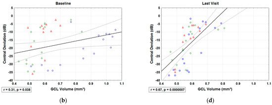 Scatterplots of correlation analyses between visual field and OCT measurements in LHON patients before and after idebenone treatment. Stronger associations were found after treatment. (a) Mean deviation (MD) vs. peripapillary retinal nerve fiber layer (pRNFL) thickness at baseline: r = 0.33, p = 0.030. (b) Central deviation (CD) vs. macular ganglion cell layer (GCL) volume at baseline: r = 0.31, p = 0.038. (c) MD vs. pRNFL thickness at last visit: r = 0.62, p = 0.000004. (d) CD vs. macular GCL thickness at last visit: r = 0.67, p = 0.0000007. Blue circles: acute patients, red triangles: early chronic patients, green diamonds: late chronic patients.