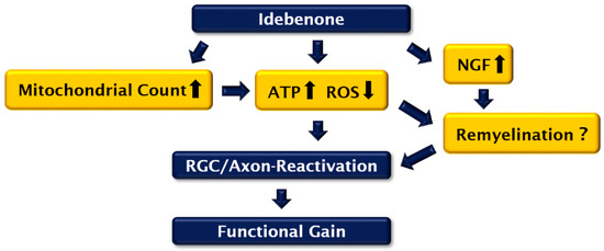 To date the exact mechanisms how idebenone promotes visual recovery in LHON have not been definitely clarified. Experimental studies using fibroblasts and cybrids carrying LHON mutations have shown that the electrochemical deficits in dysfunctional complex I of the mitochondrial respiratory chain including reduced ATP production and increased amount of ROS can be partly restored by the capacity of idebenone and its metabolites for scavenging ROS and enhancing ATP production [29,30,31]. This mechanism would be important to counteract the propagated oxidative injury that progressively disturbs RGC and optic nerve fibers in the acute stage of LHON [32]. It is also known that the dysfunctional mitochondria of LHON-mutation carriers have an increased mitophagy rate [5] and that the probability of disease conversion increases with reduced mitochondrial count per cell comparing converted to unaffected carriers [33]. Interestingly, idebenone has been shown to reduce mitophagy rate in LHON fibroblasts [5]. This could possibly increase the mitochondrial count per cell and would help to improve OXPHOS in dysfunctional RGC. Finally, histologic studies in optic nerve tissue of LHON patients found amounts of spared axons inside of affected bundles with variable myelination including denuded but viable fibers, and signs indicating remyelination processes [34,35]. Although the effect of idebenone on remyelination has not yet been directly investigated, it showed to stimulate nerve growth factor production in neural tissue [36,37], which is a known pathway of axonal survival and myelin repair [38]. In addition, several other antioxidants have shown enhanced myelin repair and glial activation in models for optic nerve lesions and central neurodegeneration [39,40,41,42]. All of these pathways could contribute to therapeutic effects of idebenone leading to a reactivated signal transduction in surviving dysfunctional ganglion cells in acute as well as in chronic LHON patients (Scheme 1).