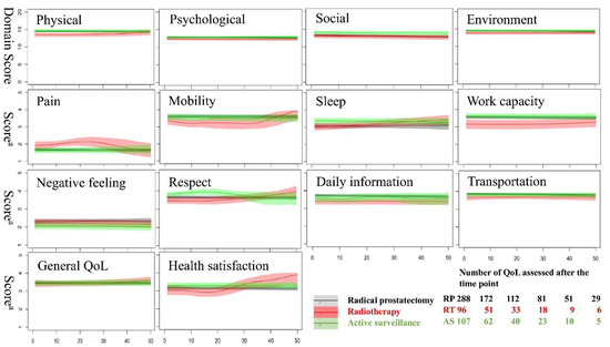 A younger age at diagnosis, better education, and incomes with a higher proportion of employment were noted in patients receiving RP compared with the other two groups. Patients with a higher risk of D’Amico risk stratification appeared more likely to receive RT, while those with a low or moderate risk received RP or AS more frequently. No statistical differences in the distributions of major comorbidities, total activities of daily living scores, initial WHOQOL-BREF domain scores, or prostate size were noted among the different groups.