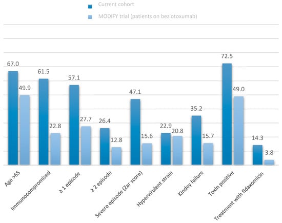 Comparison of variables in current cohort and bezlotoxumab-treated patients in MODIFY trial. Numbers show the percentage of patients.