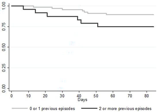 Table 2 shows the variables in patients with and without recurrence. Although a statistically significant difference was not reached, the rate of rCDI was numerically higher in patients who had suffered two or more previous CDI episodes (25.0% vs. 10.4%; p = 0.09). Figure 2 shows the Kaplan–Meier curves for the time to rCDI analysis for patients who had suffered two or more previous episodes. Similarly, the recurrence rate was also higher in patients with the 027 ribotype (4 out of 10; 40%), although in our population, the strain ribotype was only determined in 48 patients.