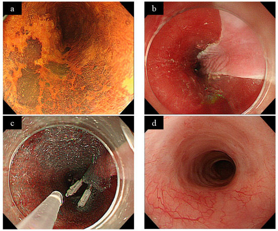- Sakaguchi, Y.; Tsuji, Y.; Ono, S.; Saito, I.; Kataoka, Y.; Takahashi, Y.; Nakayama, C.; Shichijo, S.; Matsuda, R.; Minatsuki, C.; et al. Polyglycolic acid sheets with fibrin glue can prevent esophageal stricture after endoscopic submucosal dissection. Endoscopy 2014, 47, 336–340. [Google Scholar] [CrossRef]