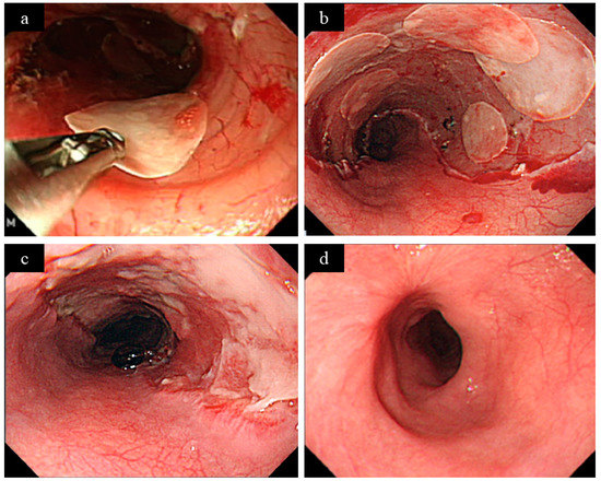 - Liao, Z.; Liao, G.; Yang, X.; Peng, X.; Zhang, X.; Xie, X.; Zhao, X.; Yang, S.; Fan, C.; Bai, J. Transplantation of autologous esophageal mucosa to prevent stricture after circumferential endoscopic submucosal dissection of early esophageal cancer (with video). Gastrointest. Endosc. 2018, 88, 543–546. [Google Scholar] [CrossRef]