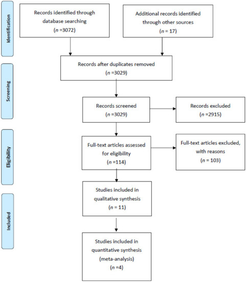 Figure 1 illustrates the study’s flow diagram. In total, 3072 records were identified through database screening and 17 through other sources. After removal of duplicates, 3029 abstracts were screened for inclusion in the systematic review. Of these, 2915 were excluded. In total, 114 full text articles were assessed for inclusion. Of these, 103 articles were excluded (10 studies involving ERAS protocols for renal transplant recipients; 27 conference abstracts with either insufficient information or duplicated data; 8 commentaries, systematic reviews, study protocols; 3 because patients with major complications were excluded; 3 because the relevant outcome data were not reported; 1 because there was no comparator; 3 because paediatric patients were enrolled; 3 because patients undergoing nephrectomy for cancer were included; 45 because they involved solitary interventions). Overall, 11 studies, 4 RCTs and 7 non-randomized cohort studies were included in the present systematic review [10,11,12,13,14,15,16,17,18,19,20].