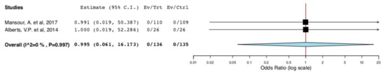 With regard to perioperative morbidity, two studies reported the incidence and the severity of postoperative complications. Figure 3 illustrates that ERAS donors had lower incidence of overall complications when compared to donors receiving standard care (95CI: 0.158, 0.582) (p < 0.001) (I2 = 0%, Het p = 0.395). The lower incidence of complications in the ERAS group accounted for Clavien–Dindo I-II complications (95CI: 0.158, 0.582) (p < 0.001) (I2 = 0%, Het p = 0.395), as illustrated in Figure 4. There was no difference in Clavien–Dindo III-V postoperative complications between the donors receiving enhanced recovery and those receiving traditional care (95CI: 0.061,16.173) (p = 0.997) (I2 = 0%, Het p = 0.997) (Figure 5).