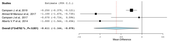 The random effect meta-analysis for the hospital length of stay between the ERAS and the standard care donors presented high heterogeneity. There was significant variation in the mean difference of the hospital lengths of stay between the ERAS and the standard care groups in the RCTs included in our meta-analysis. This was anticipated at a protocol level and was attributed to variations in the efficiency of the different ERAS protocols. More specifically, in the studies by Campsen J., et al., only IV/oral analgesia was used for perioperative pain control [11,14]. On the contrary, in the studies by Mansour A., et al. and Alberts V., et al., thoracic epidural was also used on top, for perioperative pain control [13,15]. This was done either by a one -off injection of long-lasting anaesthetic agent or by a continuous infusion of short-acting agent via an epidural catheter. In order to explore the abovementioned heterogeneity, we excluded the two studies that did not incorporate any alternative methods of perioperative pain control apart from analgesic medications. As it is illustrated in Figure 10, compared to traditional perioperative care, ERAS protocols incorporating multimodal pain control interventions result in shorter length of hospital stay by one day for the living kidney donors (95CI: −1.374, −0.763) (p < 0.01) (I2 = 0, Het p = 0.766).