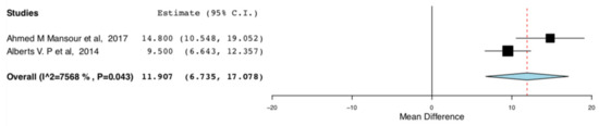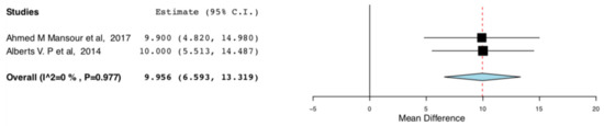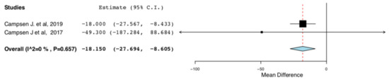 Cumulative morphine consumption for the first 48 h post op or throughout the entire hospitalization was assessed by two RCTs. ERAS donors consumed less morphine in comparison to donors receiving traditional perioperative care (95CI: −27.694, −8.605) (p < 0.01) (I2 = 0%, Het p = 0.657) (Figure 7).