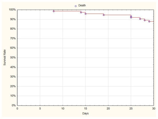 Kaplan-Meier curve presenting the 30-day survival rate of patients treated with convalescent plasma.