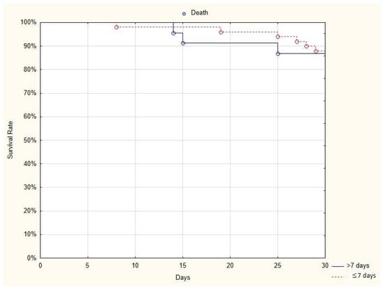 Kaplan-Meier curve presenting the 30-day survival rate of patients who received plasma in the first seven days after the onset of the disease and those who received plasma more than seven days after the onset of the disease.