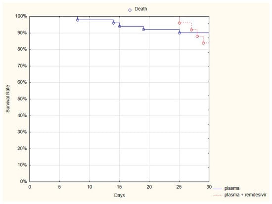 Kaplan-Meier curve presenting the 30-day survival rate of patients treated with convalescent plasma and remdesivir, and only plasma.