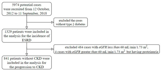 The Tri-Service General Hospital, Taipei, Taiwan, provided their research data from 12 October 2012 to 11 September 2018. Research ethics approval was given by the institutional review board to collect data without individual consent (IRB NO 1-107-05-047). Any patients with diabetes and more than one fundus color photograph session were included in this study. The start of follow-up was defined as the first fundus color photograph session. There were 5974 potential cases included in this study, but we excluded the cases without type 2 diabetes. The definition of diabetes was one of the following conditions: (1) At least two International Classification of Diseases (ICDs) of type 2 diabetes (ICD9: 250 or ICD10: E11) from half a year ago to the start time and received oral hypoglycemic agents or insulin treatments, (2) at least 2 records of more than or equal to 126 mg/dL of fasting glucose from half a year ago to the start time, and/or (3) at least 2 records of more than or equal to 6.5% of HbA1C from half a year ago to the start time. Moreover, patients were excluded if they had one of the following conditions: (1) At least one ICD of end-stage renal disease (ESRD), which is ICD9:585.6 or ICD10:N18.6, (2) lack of serum creatinine measurement within 3 days of the start time, and/or (3) at least 2 records of serum creatinine measurements after the start time. Finally, there were 1329 patients included in this study (Figure 1). We divided the cohort into two end-points. The first was traced to the incidence of ESRD in all enrolled participants and the other was people without CKD at the time of enrollment, 841 people, followed until their progression to CKD.