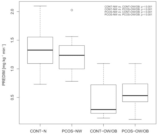 Box-whisker plot for whole body insulin sensitivity assessed by PREDIM. Abbreviations Figure 1: CONT-NW: normal weight controls; CONT-OW/OB: overweight or obese controls; PCOS-NW: normal weight PCOS; PCOS-OW/OB: overweight or obese PCOS; PREDIM: Predicted M.
