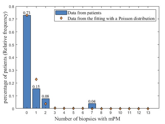Of the 26 patients, each associated with 13 biopsies (after data completion as described above), one patient had seven biopsies with mPM, two had two biopsies with mPM and four had one biopsy with mPM. For the remaining 19 patients, mPM was not detected in any of the 13 biopsies. As stated in the first part of the model, these results were displayed as a relative histogram (Figure 2). From this histogram, results were found to be properly described by a Poisson distribution. An optimization was therefore performed using the Matlab software to determine the Poisson distribution, which best fits the relative histogram. The Poisson distribution obtained by fitting (orange diamonds in Figure 2) was used to assign the probabilities that 0, 1, 2, …, or all the 13 biopsies have mPM.