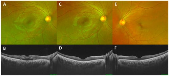 Fundus photography and optical coherence tomography (OCT) images in a 34-year-old man with acute central serous chorioretinopathy (CSC) showing serous retinal detachment (SRD) at the initial examination ((A) fundus photography; (B) OCT image), spontaneous resolution of subretinal fluid (SRF) after 1 month ((C) fundus photography; (D) OCT image)), and unaffected fellow eye ((E) fundus photography; (F) OCT image). The mean logarithm of the minimal angle of resolution (logMAR) best-corrected visual acuity was 0.00 (Snellen equivalent: 20/20) at the initial SRD phase and 0.00 (20/20) after spontaneous SRF resolution. Visual acuity in the fellow eye was 0.00 (20/20).
