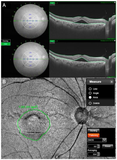- Ozdemir, I.; Eren, A.; Ersöz, G. Outer nuclear layer thickness at the central fovea relation with symptom duration in central serous chorioretinopathy. Int. Ophthalmol. 2019, 39, 1323–1328. [Google Scholar] [CrossRef]