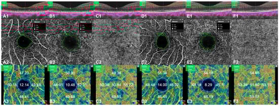FAZ area and capillary VD were measured using an SS-OCTA system. All OCTA scans were conducted by acquiring a 3 × 3 mm macular size. En face images were generated for retinal vascular networks: superficial capillary plexus (SCP), deep capillary plexus (DCP), and CC. SCP comprised capillaries from 2.6 µm below ILM to 15.6 µm below IPL. DCP extends from 15.6 to 70.2 µm below IPL. CC comprises 10.4 µm-thick capillaries to the RPE–Bruch’s membrane. The area inside the central border of the capillary network was considered as the FAZ area and was measured by manually outlining the inner border of foveal capillaries using the OCTA system software. The FAZ area was automatically calculated, and the average of the two measurements was used for analyses []. The VD was defined as the percentage area occupied by the microvasculature of each retinal vascular network at the center of the fovea. The software automatically produced maps consisting of concentric circles with diameters of 1 and 3 mm. Foveal and parafoveal VDs of the SCP, DCP, and CC were measured automatically (Figure 3) [].