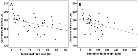 Relationship between the amount of subretinal fluid (SRF) (area and height) and outer retinal layer thickness, as determined using Spearman’s correlation coefficient analyses, in the eyes with acute central serous chorioretinopathy (CSC), showing serous retinal detachment (SRD) at the initial examination. The SRF area was moderately and negatively correlated with outer retinal layer thickness (ρ = −0.510, p = 0.002; (A)). The SRF height was also moderately and negatively correlated with outer retinal layer thickness (ρ = −0.472, p = 0.005; (B)).