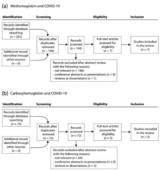 For the case of COHb and COVID-19, 73 articles were retrieved from PubMed (n = 1) and Google Scholar (n = 72), one duplicate was removed and 68 articles were excluded after abstract review, leading to three articles that were finally included in the present study [20,24,25]. The study selection process is shown in Figure 1b.
