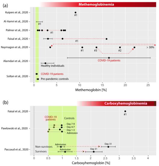Visualization of (a) methemoglobin (MetHb) and (b) carboxyhemoglobin (COHb) values of COVID-19 patients reported in the literature. The green shaded areas refer to the reference ranges for healthy individuals in case of MetHb (0.67 ± 0.33% for healthy non-smokers [15]) and COHb (0.5–1.5% for healthy non-smokers [16]). Different subjects reported in the case reports are marked with “#”, and red lines with arrows indicate the development of subject-specific values during the course of the disease.