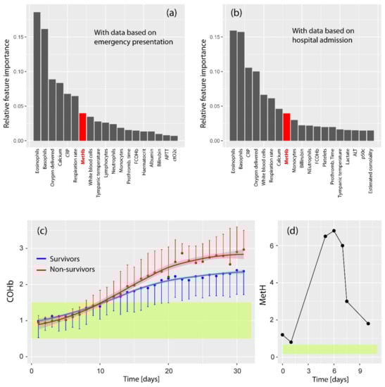 (a,b) Relative feature importance in predicting COVID-19 according to the study of Soltan et al. [19]. Two models were built, one with data based on emergency presentation (a) and one with data based on hospital admission. MetHb was a relevant parameter in both models (indicated in red). (c) COVID-19 non-survivors (n = 22) show a steeper and higher increase of COHb during the curse of the disease compared to COVID-19 survivors (n = 41), according to the study of Paccaudi et al. [24]. The two COHb time-series are statistically significantly different. The yellow bar refers to the COHb reference ranges for healthy non-smokers [16]. (d) Time-course of MetHb of a COVID-19 patient reported by Palmer et al. [22]. The yellow bar refers to the MetHb reference range for healthy non-smokers [15]. The figures show data extracted from the original figures of the respective publications.