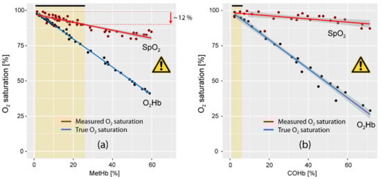 The impact of MetHb and COHb on SpO2 measured with pulse oximetry. (a) Blood MetHb vs. SpO2 and blood Hb O2 saturation (O2Hb). Data extracted from Barker et al. [86]. (b) Blood COHb vs. SpO2 and blood O2Hb saturation. Data extracted from Barker et al. [87]. In both studies, measurements were made on dogs; the inspired O2 fraction (FIO2) was 1, SpO2 was measured on the tongue with a pulse oximeter (Nellcor N-100, USA) and COHb, MetHb and O2Hb saturation with a CO-oximeter (IL-282, Instrumentation Laboratories, Bedford, MA, USA). The figures show data extracted from the original figures of the respective publications.