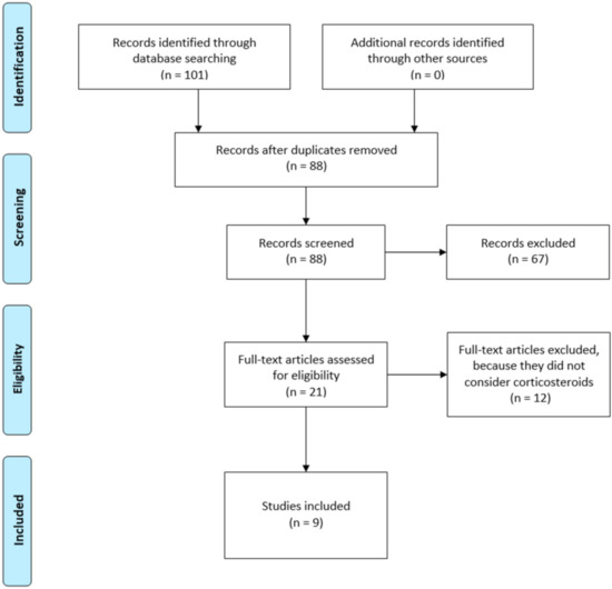 A total of 101 studies were found through the electronic searching engines. Nine studies [18,19,20,21,22,23,24,25,26] were included in this systematic review. All studies included were prospective [18,19,20,21,22,23,24,25,26,27], all of these were randomized clinical trial except one. A total of 494 shoulders were analyzed; of these 232 underwent infiltration with corticosteroids, 90 with PRP and 47 with glucose prolotherapy. The remaining patients underwent an infiltrative cycle with lidocaine or others local anesthetic as placebo.