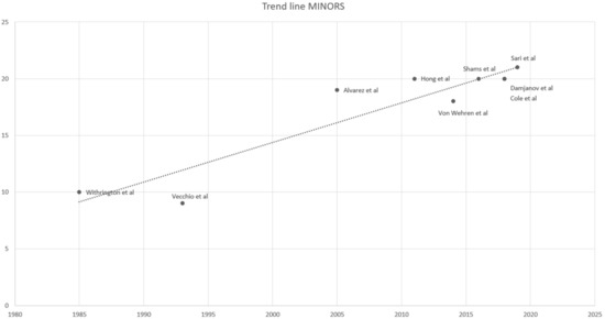 The outcomes of the methodological quality assessment are shown in Table 1. An analysis of the literature has shown a progressive improvement in the quality of studies, evaluated through the use of the MINORS score. The Spearman correlation coefficient has indeed shown a significant correlation between MINORS score and the year of publication (p < 0.01; r = 0.87). From a graphic point of view, it is possible to notice a progressive increase in the trend line from 1985 to 2019. (Figure 2).