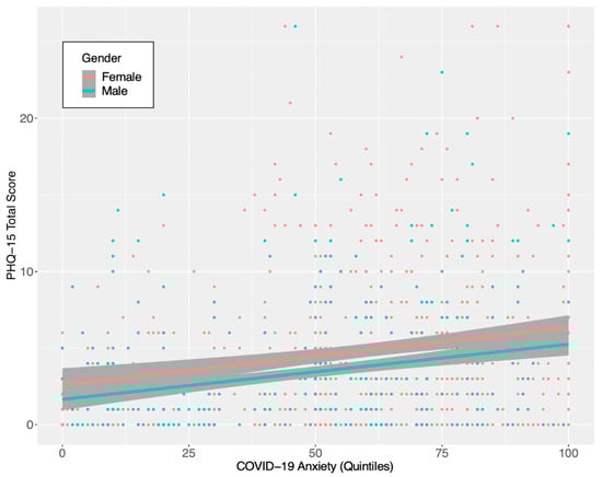 Correlations for all the variables included in Models 1 and 2 are shown in Table 1. The PHQ-15 subscales and the total score were positively and significantly correlated with COVID-19 anxiety, as well as with GAD-7 total score. These correlations are in line with results from the first wave of the UK study [20]. Figure 1 shows the relationship between COVID-19 anxiety and somatic symptoms.