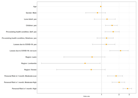 We considered anxiety and/or depression, traumatic stress, and COVID-19-related Anxiety as dependent variables in three separate multiple logistic regressions (respectively, Table 3, Table 4 and Table 5). Figure 2 shows the plot of the odds ratio for the model of traumatic stress.