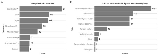 General patient evaluation and risk assessments: (A) Preoperative parameters ranked by estimated influence on return to sports (RTS) capacity of the patient. Coordination (i.e., preoperative experience with the type of sport) ranked highest with 94 counts, BMI (66 counts) second, age (64 counts) third. (B) Estimated risks associated with sports after arthroplasty: periprosthetic fractures (60 counts) ranked first, implant dislocation (41 counts) second, polyethylene wear and implant loosening (both 37 counts) ranked third.