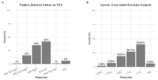 (A) Surgeons were asked to estimate the amount of patient-induced stress acting on the total knee arthroplasty. 1% ‘way too low’, 42% ‘too low’, 35 ‘just right’, 16% ‘a little too high’, 1 % ‘way too high, 6% ‘NA’. (B) Most surgeons estimated sports-associated revision surgery was ‘<1%’ (39.6%) or ‘>1%’ (26.73%), ‘>5%’ (18.81%), ‘>10%’ (6.93%), ‘>25%’ (1.98%).