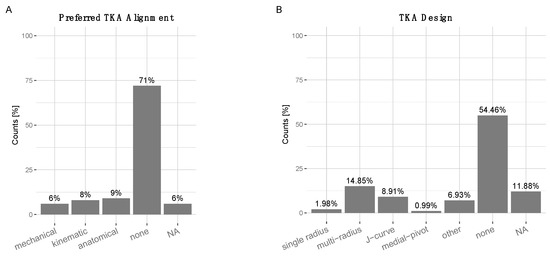 (A) Preferred TKA alignment in patients with high RTS expectations: 6% ‘mechanical’, 8% ‘kinematic’, 9% ‘anatomical’, 71% ‘no influence’, 6% NA. (B) Preferred total knee arthroplasty (TKA) design in patients with high RTS expectations. 1.98% ‘single radius’, 14.85% ‘multi-radius’, 8.91% ‘J-curve’, 0.99% ‘medial-pivot’, 6.93% ‘unspecified other’, 54.46% ‘no influence’, 11.88% NA.
