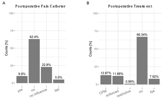 Pain catheters: were applied by only 9.9% of surgeons. 62.4% did not opt for the application of any pain catheters, 22.8% stated it had no influence, 5% NA (Figure 5A). Postoperative treatment and rehabilitation: The majority of surgeons 66.34% did not recommend any specialized postoperative rehabilitation or treatment other than the standard rehabilitation programs in patients with high RTS expectations. At least 12.87% recommended a continuous passive motion (CPM), 11.88% an enforced rehabilitation program, 0.99% a more restrictive rehabilitation program and 7.92% NA (Figure 5B).