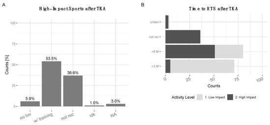 (A) Recommendations for high-impact sports after TKA: 5.9% ‘no lim’=‘no limitations’, 53.5% ‘w/ training’=‘with training’, 36.6% ‘not rec’=‘not recommended’, 1% ‘idk’=’I do not know’, 3% NA. (B) Time to return to sports (RTS) after TKA recommendations (absolute counts): High-impact sports (black)–‘>3M’ (5 counts), ‘>6M’ (49 counts), ‘not recommended’ (36 counts), ‘undecided’ (2 counts). Low-impact sports (light grey)–‘>3M’ (64 counts), ‘>6M’ (49 counts), ‘not rec’=‘not recommended’ (0 counts), ‘undec’=‘undecided’ (1 counts).