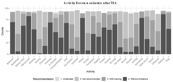 Activity recommendation after TKA. The y-axis represents absolute counts, the x-axis represents the type of activity/sport. ‘Ballroom’ has been abbreviated for ‘Ballroom dancing’. Recommendations ‘without limitations’ (dark grey), ‘with adequate training’ (medium grey), ‘not recommended’ (light grey), ‘undecided’ (lightest grey).