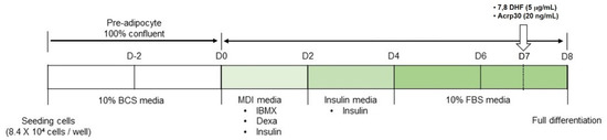 Mouse embryonic fibroblasts 3T3-L1 cell line was purchased from the American Type Culture Collection (ATCC; Manassas, VA, USA). The preadipocyte 3T3-L1 cells were cultured in Dulbecco’s Modified Eagle’s Medium (DMEM) with 10% bovine calf serum (BCS) and 100 U/mL penicillin-streptomycin and maintained at 37 °C in a 5% CO₂ incubator. Cells were cultured in 6-well culture plates with media change for 2 days. Upon reaching 100% confluence (Day 0), cells for differentiation were cultured with 0.5 mM 1-methyl-3-isobutyl-xantin (IBMX), 1 μM dexamethasone, 1 μg/mL insulin in DMEM containing 10% FBS (MDI differentiation medium) for 2 days. After 2 days (Day 2), cells were cultured with 1 μg/mL insulin in DMEM containing 10% FBS (Insulin medium) for another 2 days. After 2 days (Day 4), cells maintained in DMEM containing 10% FBS for 4 days and medium was replaced every 2 days until fully differentiated (Day 8). Cells for undifferentiated adipocytes were maintained for the same period without differentiation-inducing drug treatment. Differentiation protocol is shown in Figure 1.
