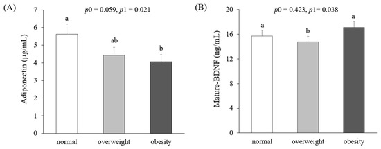 Circulating levels of adiponectin (A) and mature-brain-derived neurotrophic factors (BDNFs) (B) according to obesity status. Means ± S.E. tested by one-way analysis of variance (ANOVA) (p0) and general linear model by Bonfferoni correction with adjustment for age, smoking, drinking, menopausal status, and total calorie intake (p1). Sharing the same alphabet letter (a or b) indicates no statistical significance among the values.