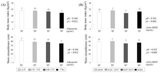 Based on the results in Figure 2, we subdivided study subjects into quartile groups according to circulating adiponectin or active-BDNF levels (Figure 3A,B). Both BMI and waist circumference levels were significantly lower in the lowest adiponectin group (Q4) than in the highest adiponectin group (Q1) after the adjustment (Figure 3A). On the other hand, the levels of BMI and waist circumference show inconsistent patterns according to mature-BDNF levels (Figure 3B).