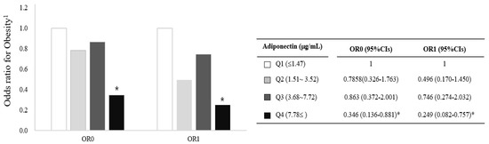 Risk of obesity (BMI ≥25 kg/m2) associated with circulating adiponectin concentrations in Korean women. * p < 0.05 compared with the reference group (Q1). The association was calculated using the OR (95% CIs) of a logistic regression model with adjustment for age, smoking, drinking, menopausal status, and total calorie intake; 1: BMI ≥25 kg/m2, CI: confidence interval, OR: odds ratio, Q: quartile.