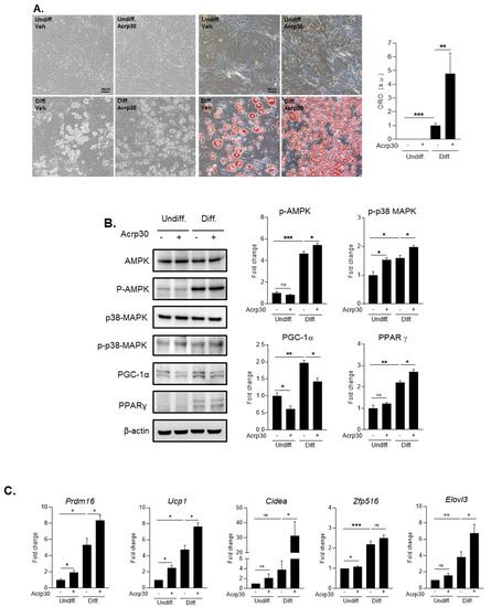 The effect of Acrp30 (adiponectin) treatment in undifferentiated and differentiated 3T3-L1 adipocyte cells. (A) Adipocyte differentiation and lipid accumulation by Oil red O staining, (B) protein expression related to adipocyte differentiation, (C) mRNA expression of genes involved in body fat browning. Means ± S.E. tested by independent t-test (nonparametric). * p < 0.05, ** p < 0.01, *** p < 0.001, n.s.: no significance; 20 ng/mL treatment of Arp30; undiff: undifferentiated cells, diff: differentiated cells.